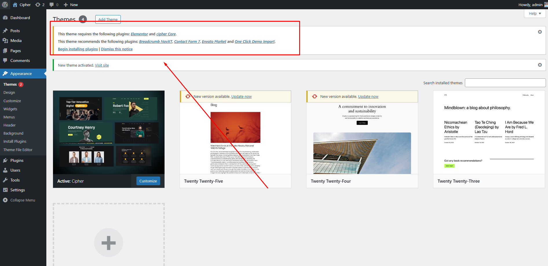 Appearance → Themes → Add New Click on “Choose File” and select cipher.zip and Click on