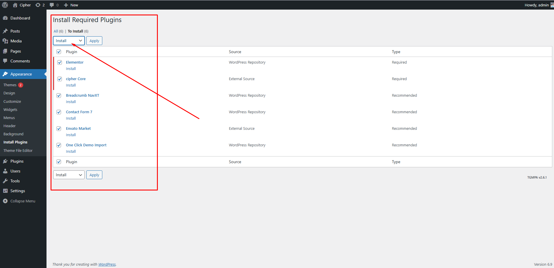 Toggle all the required plugins and hit “Install”;
