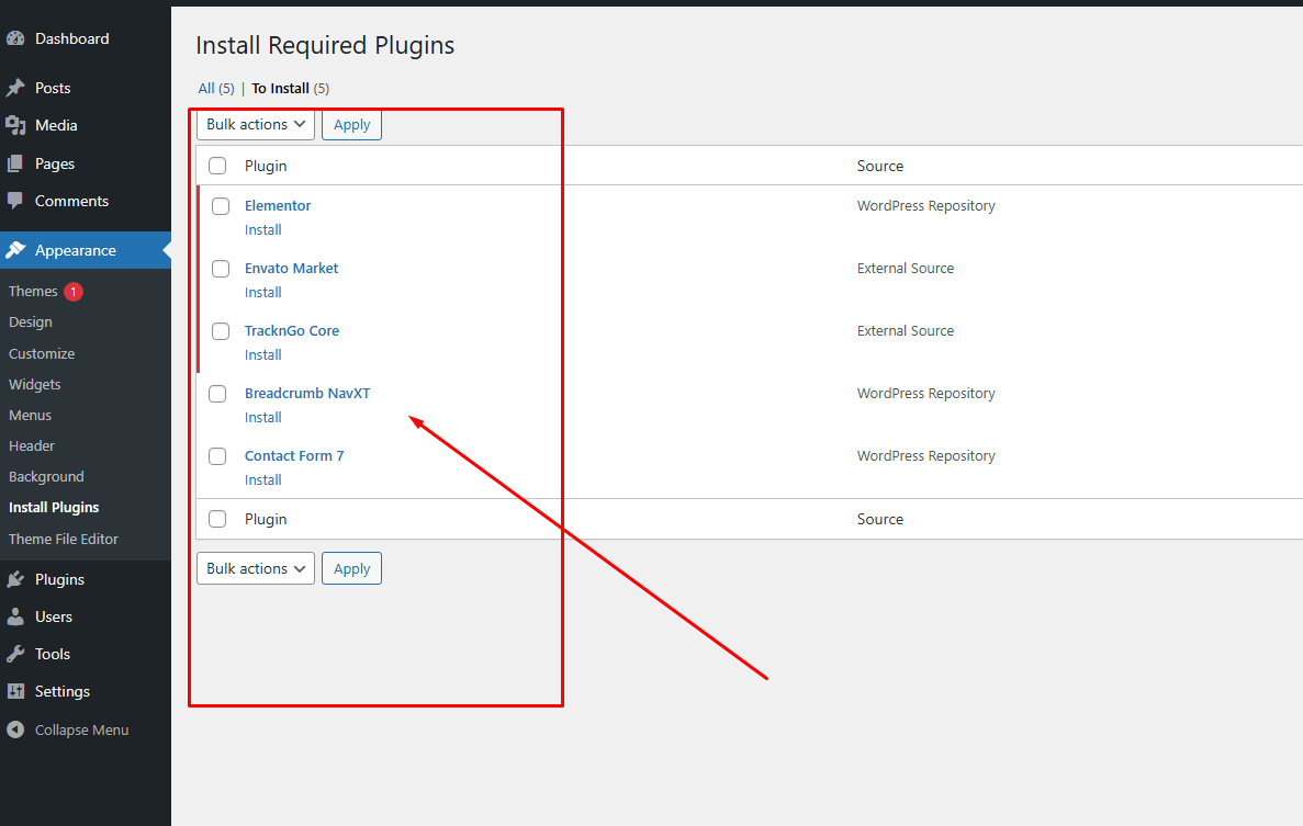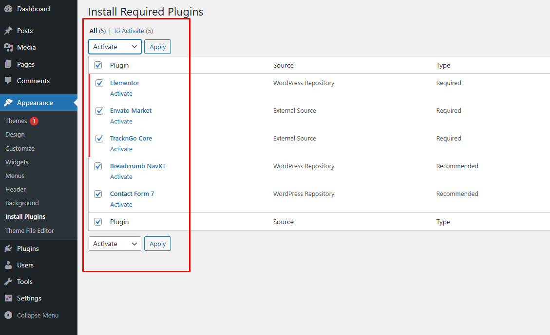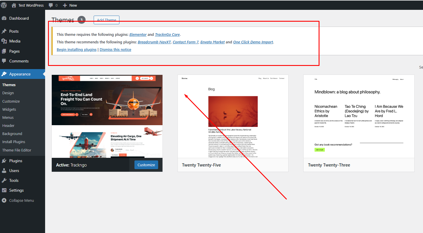 Trackngo theme requires a set of core and additional plugins to function correctly. A plugin is an additional component that offers functionality and features beyond a typical WordPress installation. Without them, most of its functionality is not available. After installing the theme you will be prompted to install the required plugins at the top of your dashboard.